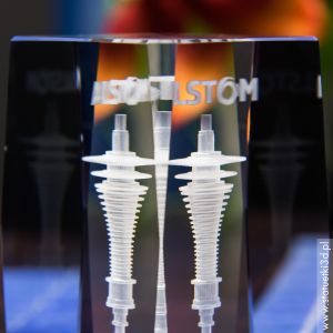 Prezentowana statuetka została wykonana na zamówienie naszego klienta. Wewnątrz znajduje się model 3D turbiny oraz logo obdarowywanej firmy. Statuetki zapakowane były w eleganckie etui.
